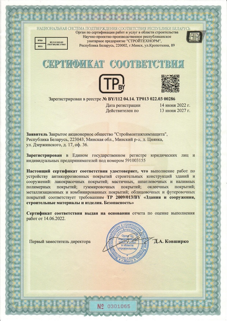 В связи с вышеизложенным, ЗАО «Строймонтажхимзащита» предлагает Вам сотрудничество и предоставляет пакет необходимых документов, включая лицензии и сертификаты на осуществление вышеназванных работ, отзывы предприятий и другие.